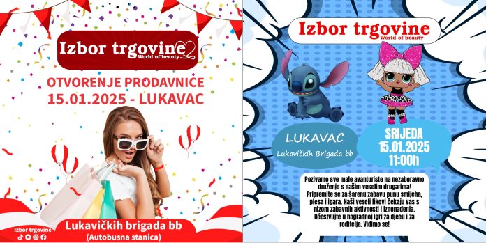 Izbor trgovine, poznate po širokom asortimanu i pristupačnim cijenama, otvara prodavnicu na novoj adresi u Lukavcu. Svečano otvaranje zakazano je za srijedu, 15. januar od 09:00 sati, na adresi Lukavačkih brigada bb, u neposrednoj blizini autobuske stanice.