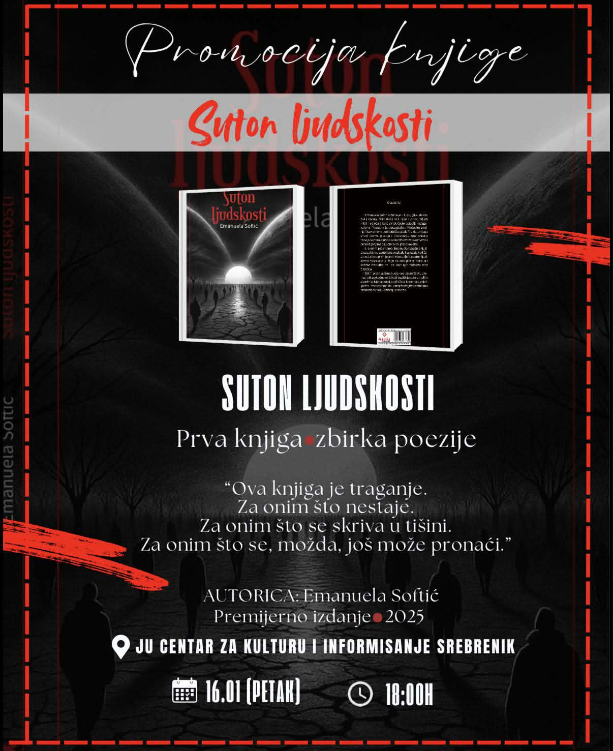 Srebrenik će u petak, 16. januara, biti domaćin značajnog kulturnog događaja – promocije knjige „Suton ljudskosti“, prve zbirke poezije autorice Emanuele Softić. Promocija će biti održana u JU Centar za kulturu i informisanje Srebrenik, s početkom u 18:00 sati.
